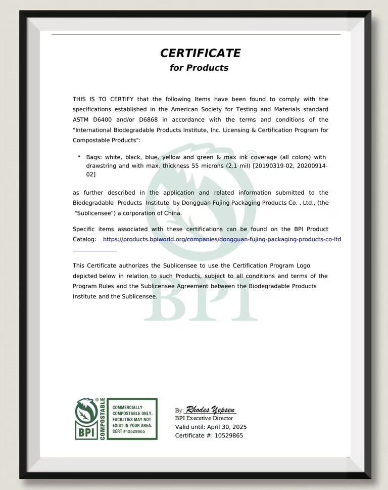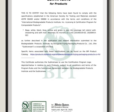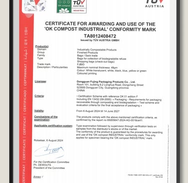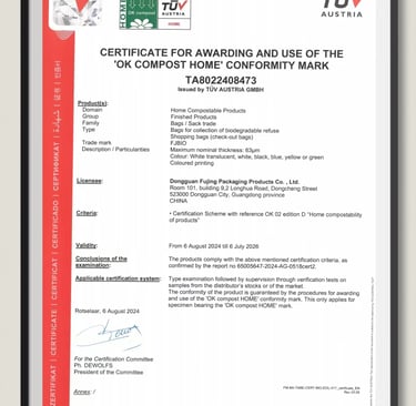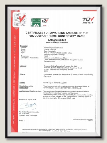 As a TÜV Rheinland certified biodegradable packaging expert, our products meet the highest global standards, including US ASTM D6400, EU EN13432 (industrial compostable) and AS 5810 (home compostable) certifications. Our Dongguan factory uses ISO 14001 environmental management system to ensure full compliance with the EU Green Deal and China's "plastic ban" policy.